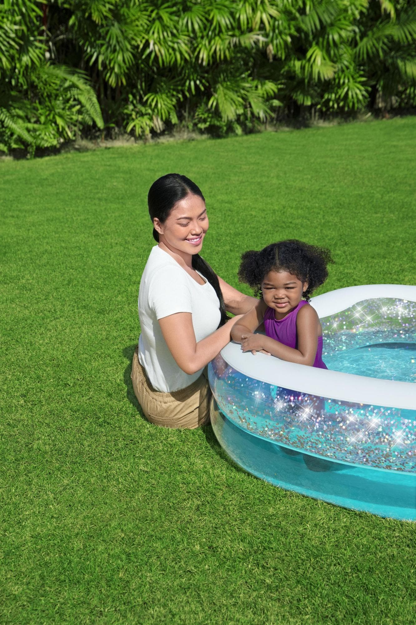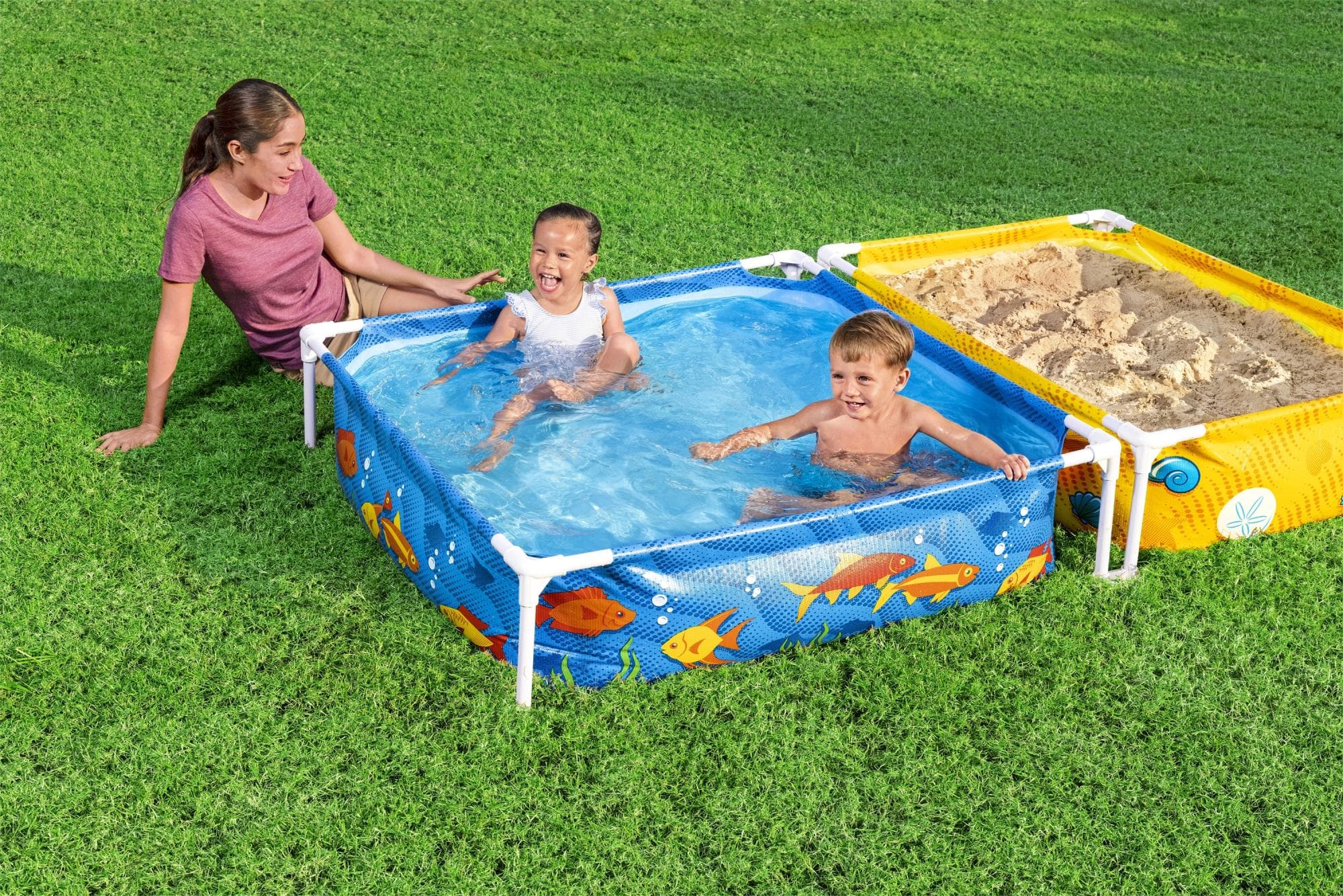 Un parco acquatico, un soffiatore (sostegni inclusi), un tubo spray, custodia, otto picchetti, un kit di riparazione